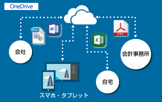 MicrosoftのOne Driveは双方向オンラインストレージサービスなのでファイル共有が非常に簡単です。もちろんスマートフォンやタブレットでも閲覧可能です。
